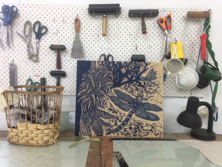 Finished board that makes up a larger 12 piece board to be printed with a steam roller at Te Kowhai Print Studios, Whangarei! Awesome project to bring our printmaking community together and make something BIG!! Colab pieces are always a great opportunity to explore new subject matter, so enjoyed carving this beautiful native dragonfly.