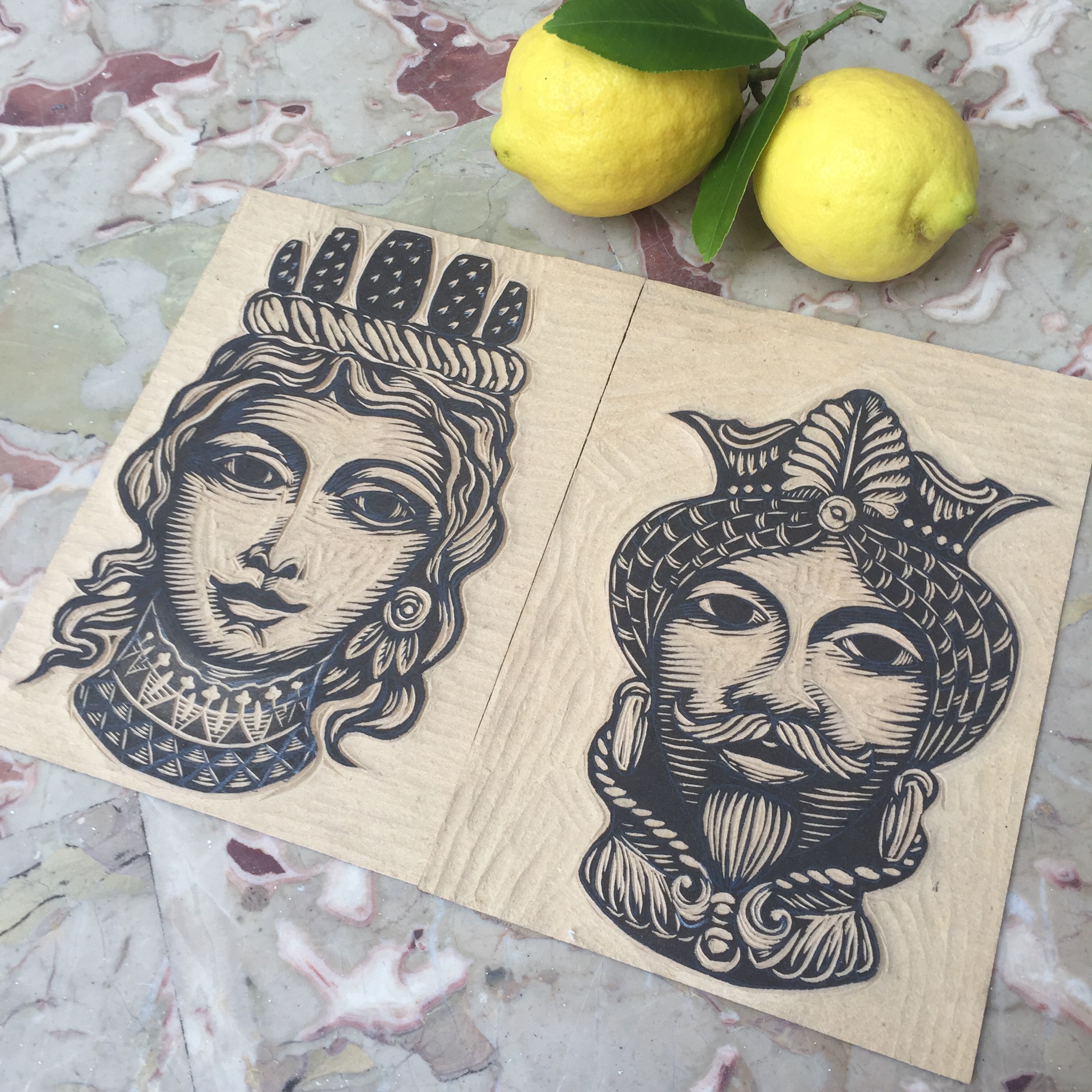 Finished carving two woodblocks today inspired by a 900 year old Sicilian legend which I particularly love as it encapsulates so many aspects of this island that I love, the many layers of multi-cultural history, the passion and the endless element of surprise. There are several versions, but this is my favourite, as it’s set in Palermo!
