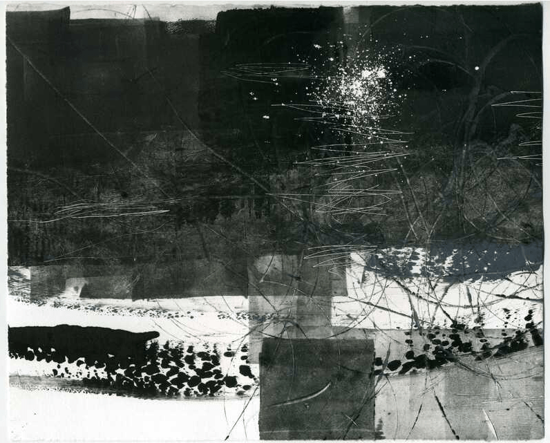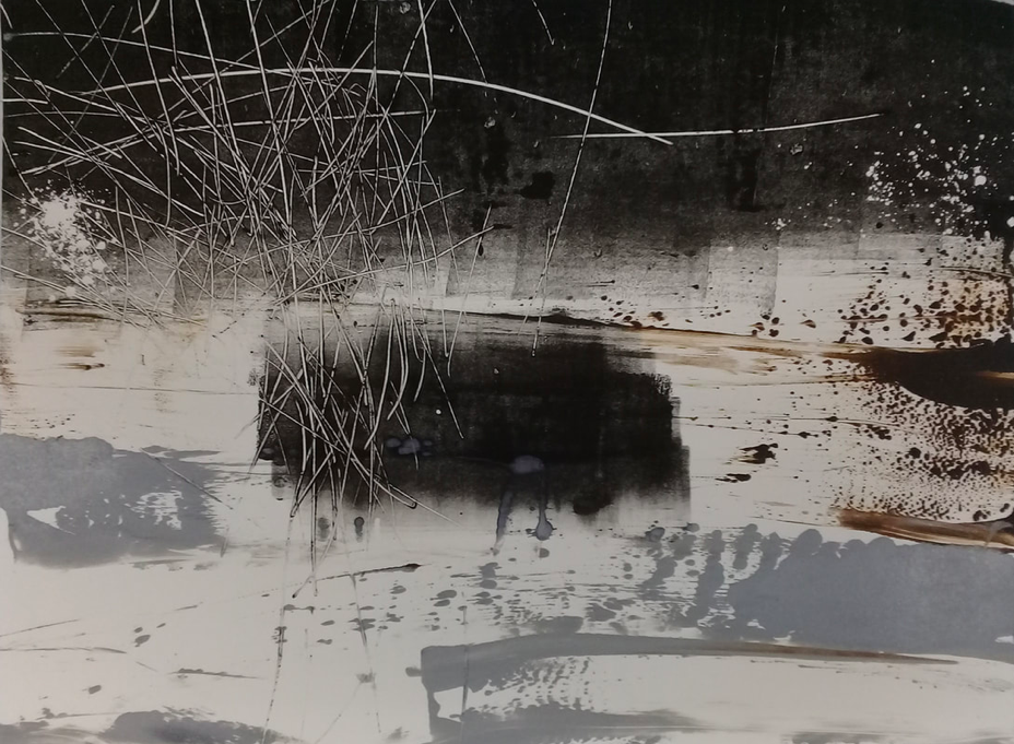 This approach, not only informs her printmaking practice but also underpins the teaching methodology used in her classes as she has noticed how quickly students advance and are able to see their own progress. For Durkin, this focused, experimental approach allowed her to develop more abstracted work and although pictorial elements still occasionally feature in her prints, she is happy with how her printmaking practice has progressed, and this has inspired her to devote the majority of her studio time to printmaking. She muses at her original notion of moving through all the printmaking techniques in a single year as she is still exploring the endless possibilities of black and white monoprints. About a year and a half ago she started working on a suite of images evoking watery landscapes, after noticing that many of her abstract work reminded her of water. Each work has a sense of depth through layers of varied, expressive mark making, bringing her subdued colour palette to life with a buzz of activity.
