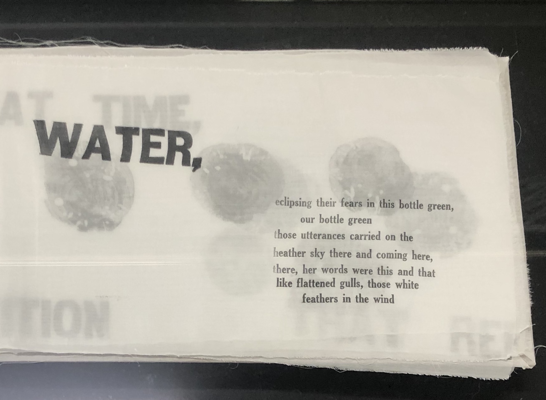 Her journey involved visiting Hamilton’s Gap named after her family who received land there under the waste lands act of 1859. She collected pieces of driftwood, some of which she sliced and hand-printed onto paper and thin cotton silk. The transparent nature of the fabric allows for the printed images and words to merge when placed together, and for details to come into focus when the pages are pulled apart. As the viewer moves through the pages there is an accumulation of knowledge and information so that you can see through the fabric what you have previously looked at and ahead of you. She compares this to the process of uncovering information about her own family histories, how individual details have little meaning until other layers of meaning are added to them over time.