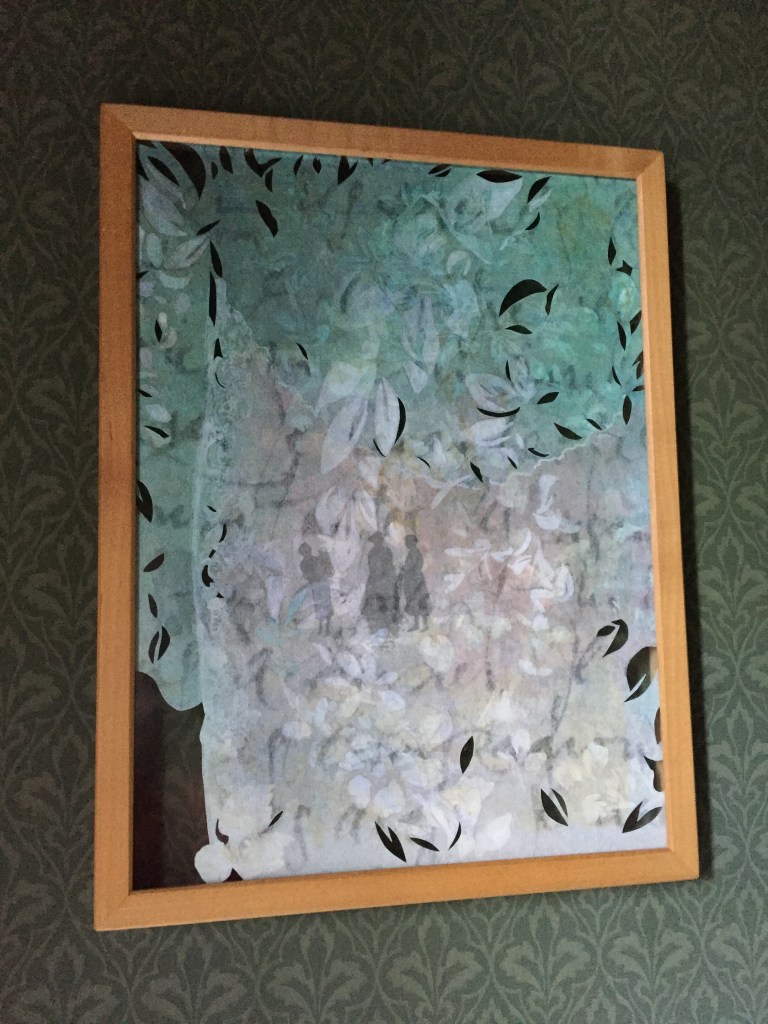 In keeping with the colour palette of the existing wallpaper, some of the pieces appear to melt into the room in which they’re hung. This is accentuated by the shapes cut out and removed from the image, revealing the wall behind it, bringing the past and present together into a continuum of partially told stories. Playing with this idea of absence is an acknowledgement of the missing or incomplete stories about the buildings, their objects and the people that resided there. In one work, a drawing of a chair sits in the corner of a room, although on close inspection parts have been left incomplete, as is the history of the artefact.