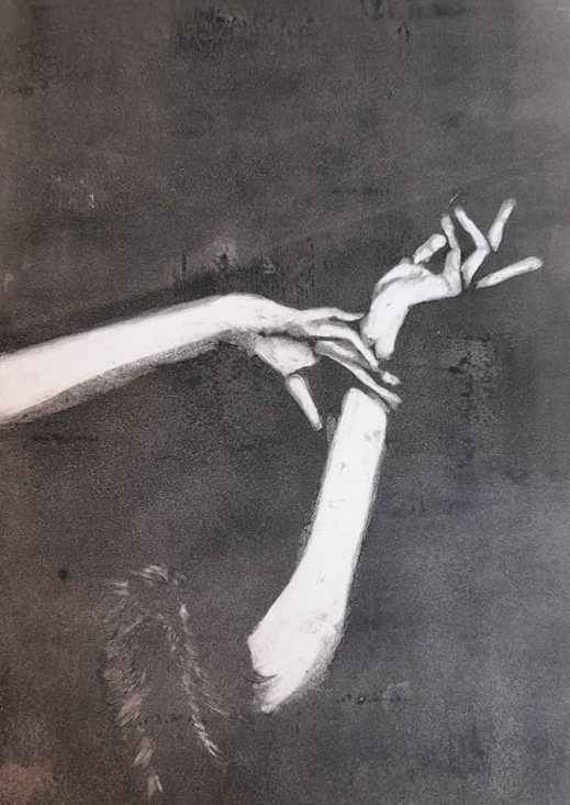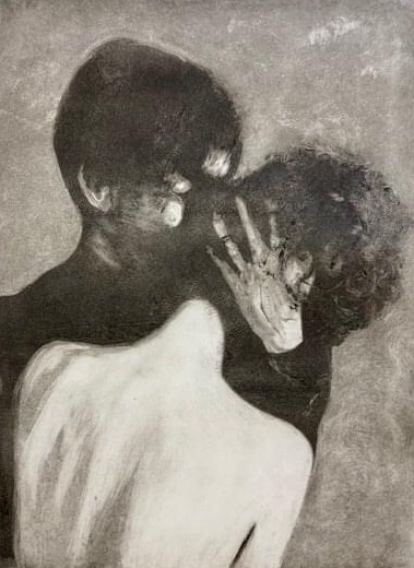 The idea of fluidity and movement is expressed in Molineux’s figurative monotypes. Her prints have a softness to them, using layers of black ink with different quantities of transparency, creating a lucid, dreamy quality to her imagery. Hands and bodies entwine in an intimate embrace, caught up in a rhythmic dance. Music is central to her arts practice, always listening to music as she paints, inspiring how she paints.