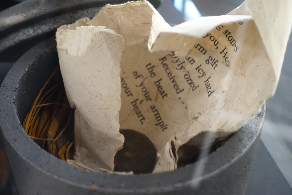 In Beth Serjeant’s Honing, a tiny, black cast bronze pebble rests inside a single piece of crumpled, handmade harakeke paper containing a poem written by Serjeant for poet Hone Tuwhare about their first encounter resulting in a lifelong friendship. The page sits on a bed of harakeke, placed inside a black cork box, the paint mixed with metallic black sand from her local beach, appearing as a solid cast iron vessel protecting the treasure it contains within. The container in which an artist’s book is stored is an essential element in communicating the concept of the total work. It is the gateway to the viewers experience and as such prepared with as much thought and precision as the object it contains.