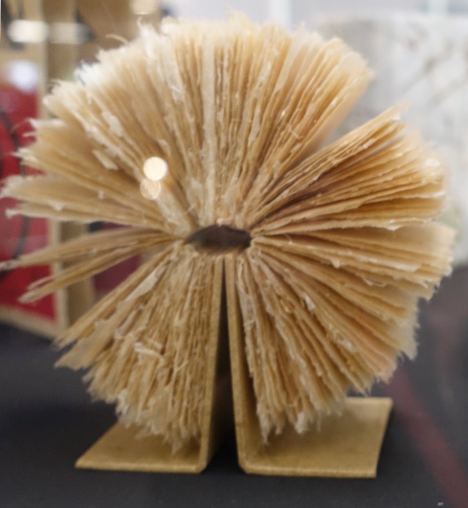 The artist’s book is a genre that is hard to define, perhaps due to its very nature of defying the traditional definitions of a book. Encompassing various disciplines, media and process from sculpture to photography, installation to papermaking, the possibilities for artist’s books are endless, limited only by the imagination of the artist. Out of the Cupboard aims to inspire audiences about the sculptural possibilities of books, and raises the question – what makes a book a book? Can it be a book if there are no pages to turn or no words on the page? Elizabeth Steiner’s Flax Mill Wheel, a wagon wheel bound from handmade ginger paper, concertina’s out to sit as an undulant circle, void of text, inviting the viewer to envisage their own narrative for the object.