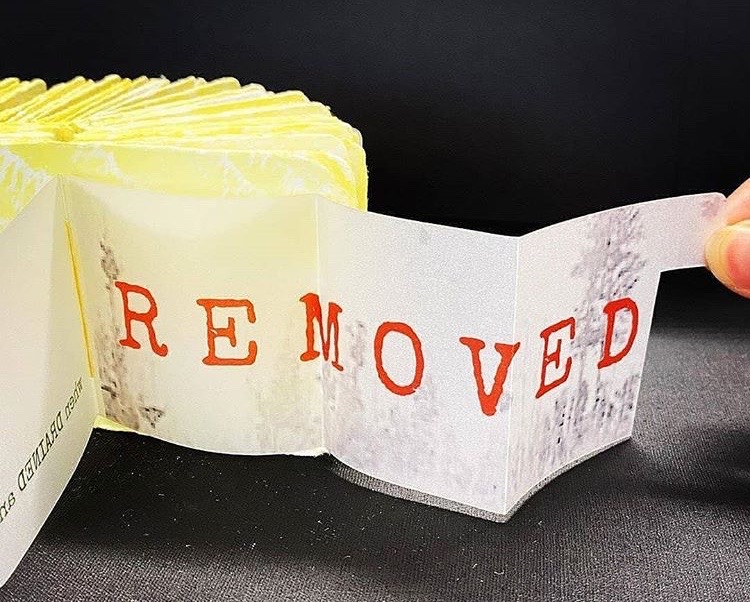 Within the collection on display, a variety of structural forms have been chosen, each one strongly connected to the concept of the work. Toni Hartill’s Butter Book – A Buttery Demise completely absorbs the viewer in numerous images and pull-out inserts that bear witness to the destruction of over sixty percent of kahikatea forests in the early 1900s in order to export dairy to the UK. Appearing as a block of butter, it opens out into a wagon wheel, the inserts bringing to mind government files, from which words and phrases have been taken. One of the most intriguing aspects of this genre is the slow reveal – the many layers of details concealed in the structure that take time to discover and require the viewer to become actively engaged in the process of seeing the object. The Wai-te-Ata Companion to Poetry box published by Wai-te-Ata Press is comprised of several poems rendered as three-dimensional objects inspired by the written content, abandoning the white rectangular page.