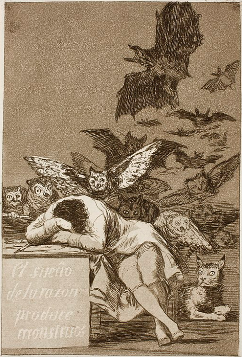 Left: The Three Trees (1643) by Rembrandt van Rijn. Etching and drypoint, 213mm x 279mm Source: Wikimedia Commons. Right: The Sleep of Reason Produces Monsters (1798) by Francisco Goya. Etching with aquatint and other intaglio media. Source: Wikimedia Commons