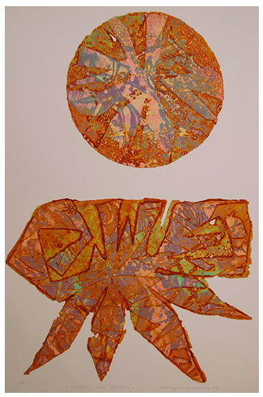 Left to right: Hen (1945) by Sue Fuller. Engraving and soft-ground etching, 372mm × 302mm. Source: http://www.metmuseum.org Crown of Thorns (1969) by Sheigla Hartman. Color Viscosity Intaglio, 560mm x 370mm. Source: www.tyrusclutter.com, L’Oeil (The Eye) (1971) by Stanley William Hayter. Color Viscosity Intaglio, 380mm diameter. Source: www.tyrusclutter.com