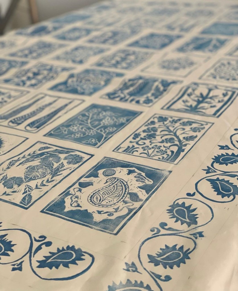 Their first project was to create a collaborate print inspired by the Persian rugs and tablecloths of Sahar’s hometown. Using small squares of linocut they carved a selection of traditional Persian motifs and designs to complete the grid of 49 squares that make up the piece. The traditional practice of block printing large square tablecloths by hand is still very popular in Iran and these colourful, hand printed textiles are much sought after works of art. The group has also explored screen printing using hand cut stencils on paper, fabric, clothing and objects.