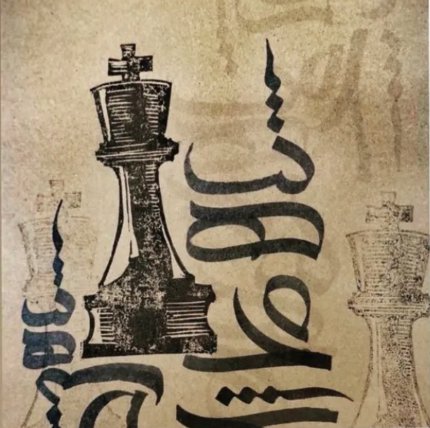 Boroujeni often combines traditional Persian calligraphy with graphic lino cut images. Her latest body of work features several chess pieces; the King, Knight and Tower. This imagery was developed in response to the current political climate in Iran, which she describes as a psychological battlefield. Each piece represents a different player in the uprising and their quest to protect their values and win the battle.