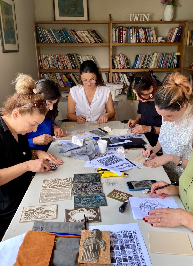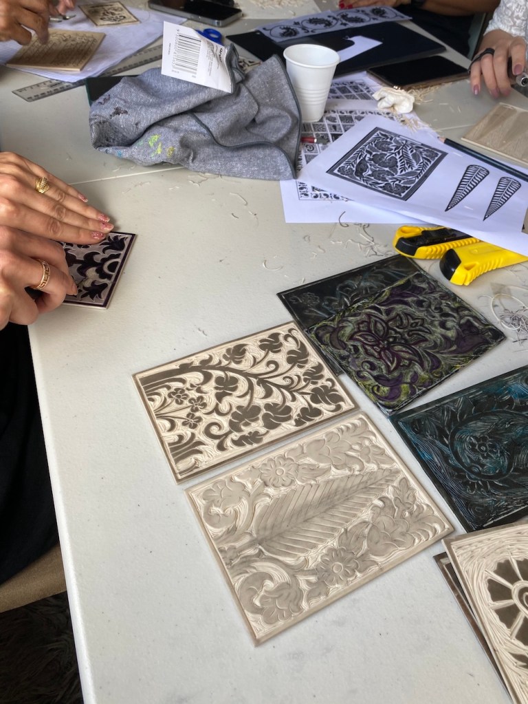 Based in Auckland, Iranian Women in NZ (IWIN) was established in 2020 as a charitable organisation to support migrant woman from Iran. From this group of over 400 members, there are roughly 34 artists who work towards producing an annual group exhibition in July. One of the group’s members, Sahar Boroujeni, recently brought together nine of these artists to participate in a printmaking project for the Printopia Festival of Original Print at Corban Estate Arts Centre, 5 – 7 May 2023. Some of the artists had previous experience with printmaking and others had never done any kind of printmaking before but were interested in learning a new technique that could be incorporated into their arts practice.