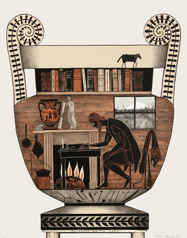 Throughout her time as a master printer, she has been equally committed to pursuing her own printmaking practice, including drawing and painting, exhibiting regularly at home and abroad. From the late nineties Maguire started to incorporate imagery into her work inspired by the narrative and aesthetic characteristics of Greek vases. Divine heroes from Greek mythology are depicted in juxtaposition with mythical creatures and gods from Māori mythology, such as Maui wrestling a lion and Herakles wrestling a taniwha. This led to several bodies of work where Greek myths and figures were transplanted into the New Zealand’s colonial past commenting directly on these contested histories.