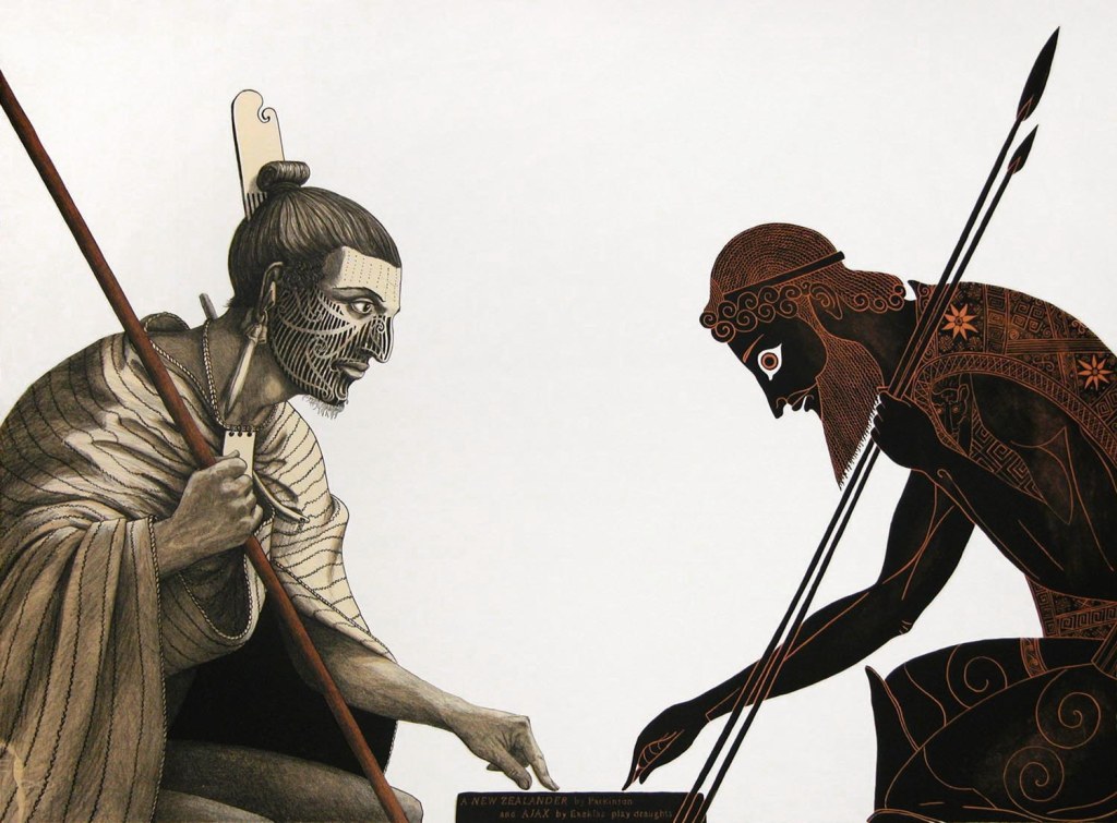 In the series The Odyssey of Captain Cook (2005) Maguire examines the first encounter between two cultures, directly referencing historical drawings and paintings from the colonial era and injecting her signature silhouetted figures from Greek vase paintings into the frame. Ambiguity shrouds the interactions between these figures and characters from our local history. As they come face-to-face with each other it is uncertain whether their exchange is friendly and welcoming or with hostility and in defence. In another series, The Labours of Herakles (2008), Herakles is represented carrying out various colonial tasks such as signing the treaty, clearing land and making boundaries. In Titokowaru’s Dilemma (2011) Socrates poses questions that address the ethical issues of colonisation in light of the atrocities of the land wars in the late 1860s, with Mt. Taranaki standing luminous in the background. These etchings replicate the feel of old-fashioned black and white photographs used by colonisers to document history, giving a sense of going back in time. For Maguire etching and lithography provide the perfect aesthetic for depicting black-figure Greek vase painting, as well as being the mediums that would have been used to initially document these voyages and clashes of civilisations.