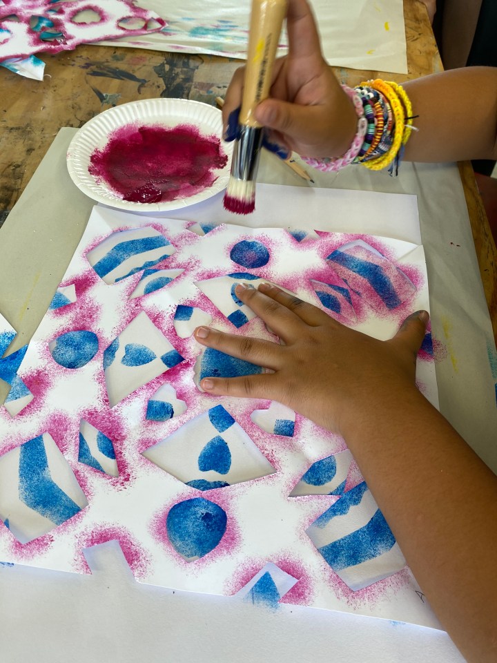 I have taught this as a school holiday programme and to primary school groups for a 2-hour and 4-hour workshop. I have adapted this, using the stencils to screen print onto fabric to make bandanas.