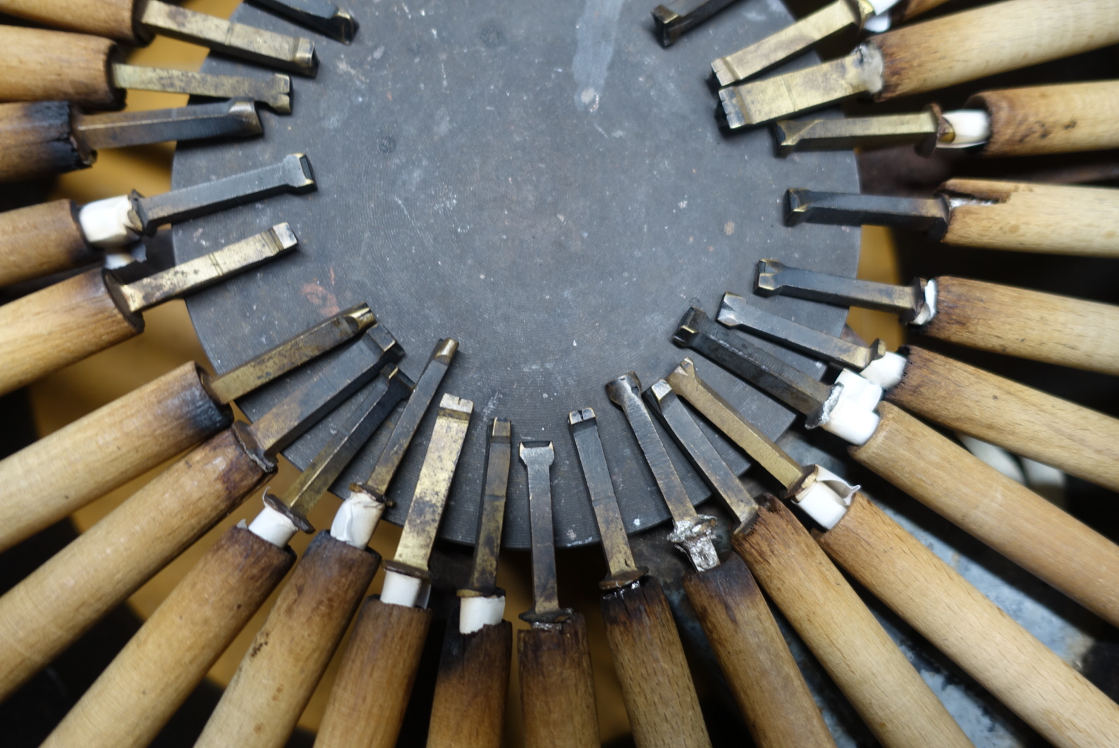 The Printery is the largest room in the studio and houses an impressive collection of printing presses; an Intertype linecaster, a Heidelberg Platen, a small Albion handpress, an Arab treadle and his favourite – a Vandercook SP-15 reproduction proof press. There are also more modern machines such as a photopolymer plate maker. The Printery is only able to accommodate ten per cent of the total number of presses they have; the rest are kept off-site where they are restored and re-homed. Selling refurbished machinery and providing workshops to train new owners on how to use them is one of WCBA’s biggest income streams. There is a waiting list for presses from around the country and they have recently sent two large letterpress machines to Taiwan. The WCBA continues to source equipment whenever they can and when the printing museum in Melbourne closed, brought two containers worth of their equipment.